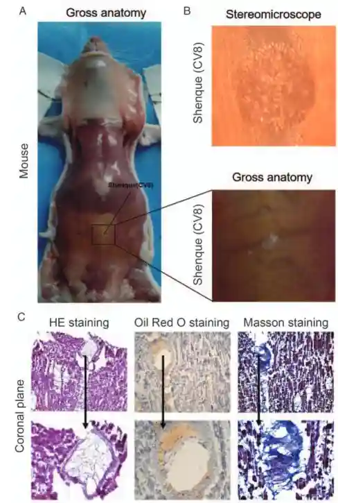 通过体视显微镜,研究人员观察到小鼠的神阙区域,发现腹白线处的脂肪组织以团块状呈现。经过HE染色、油红O染色和Masson染色的分析,研究团队发现这些脂肪团的中心为脂肪组织,外部则被结缔组织包裹。