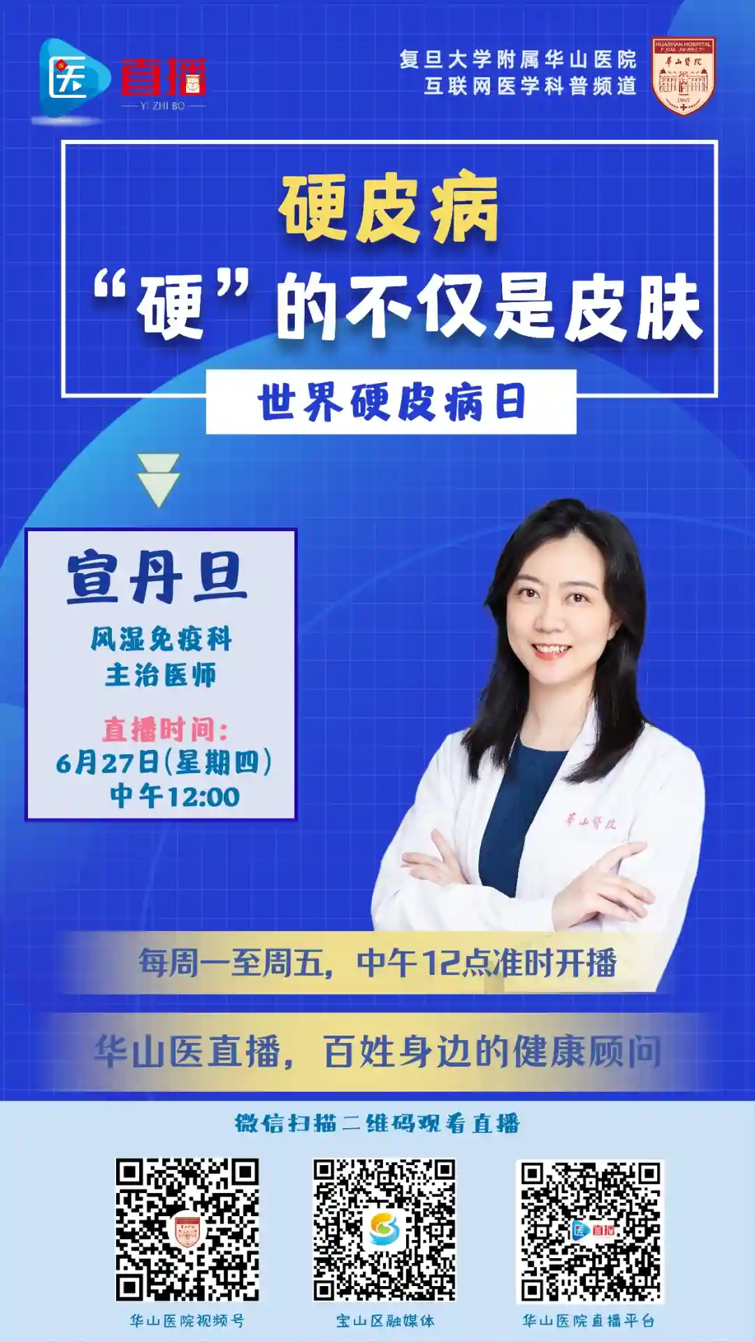 “我的手怎么一遇到冷水就发白发紫发红?”“我的手怎么看起来肿肿的好像还有点硬邦邦的?”这些可能都是系统性硬化症的表现。每年的6月29日是世界硬皮病日,作为首批被纳入罕见病目录的疾病,系统性硬化症由于发病率低、起病隐匿而常常被忽视。在疾病出现明显症状后再治疗往往会错失最佳治疗时机,所以早期发现疾病预警信号非常重要。本期医直播,宣丹旦为大家讲解什么是系统性硬化症及如何早期筛查疾病。