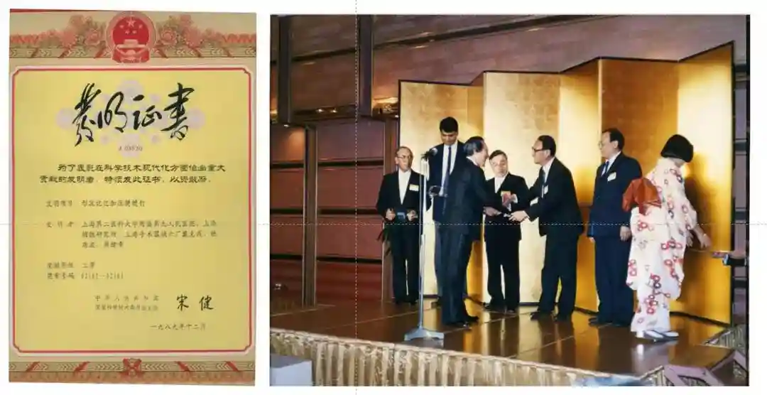 图2戴尅戎在国际上首先将形状记忆合金用于医疗,获国家发明二等奖(1989)(左),并于1990年在名古屋国际形状记忆合金医学应用会议上获奠基人金杯(右)
