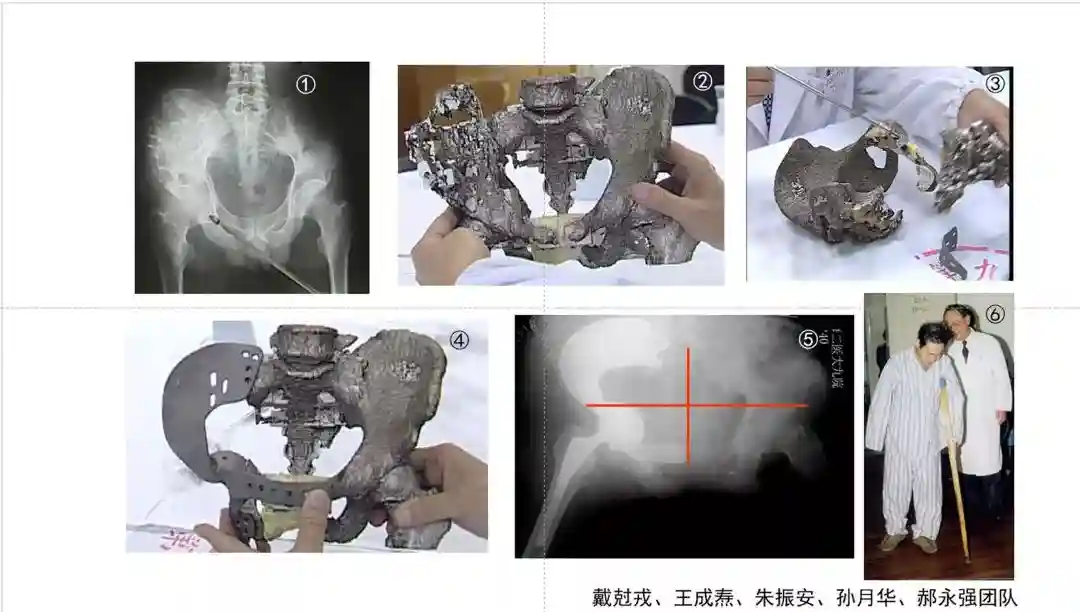 骨盆是联结躯干和下肢并提供负重和运动的重要枢纽,一旦发生肿瘤或畸形,往往治疗困难,难以彻底切除病变和重建骨盆。从上世纪末开始,借助于3D打印技术,依据骨盆模型的帮助,通过计算机辅助设计与加工,戴尅戎、王成焘团队连续应用3D打印内植物,为多例骨盆肿瘤和广泛骨溶解的病人完成了切除病变、重建骨盆的手术,均获成功(图3)。