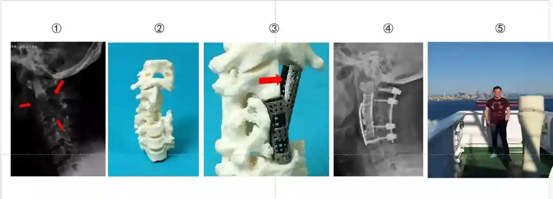 图4①第1~6颈椎巨大肿瘤;②在3D打印标本上设计手术切除范围;③3D打印定制假体的设计、制作与试安装;④术后X线片;⑤术后一年半,在远洋船上担任船工