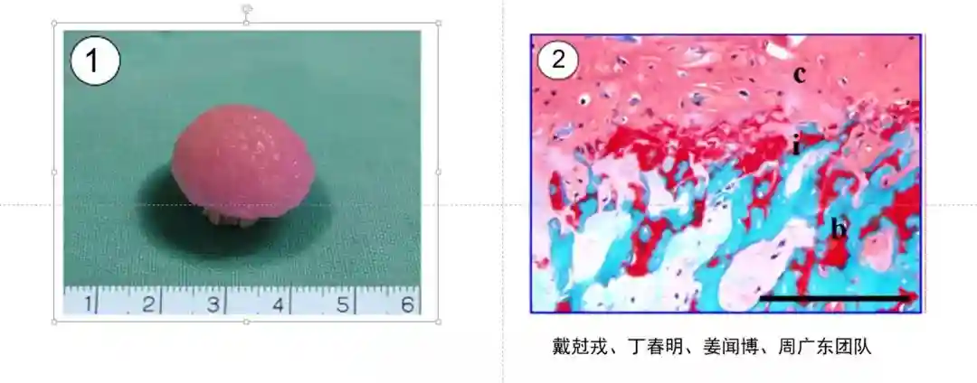 图5①3D生物打印羊股骨头,在体培养10周后;②组织切片显示打印的股骨头软骨层与软骨下骨生长良好