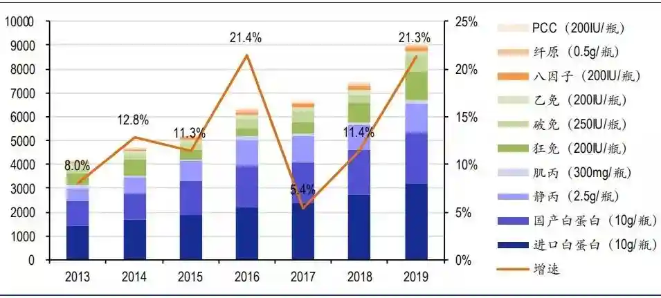 从前述国内市场主要的血制品品种来看,主要品种基本还是集中在人血白蛋白,批签发量占整个血液制品的半数以上。分品种来看,大多品种2019年保持较大幅度的增长,尤其是一些批签发量相对较大的品种,批签发量超过1000万瓶的品种均保持增长,其中增幅最大的是狂犬病人免疫球蛋白,超过35%。