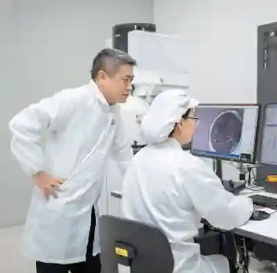 新加坡胜科纳米科技服务有限公司创始人李晓旻(左)同员工一起进行芯片检测。新加坡胜科纳米科技服务有限公司供图