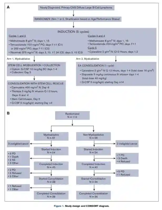 CALGB(Alliance)51101是一项随机、开放标签、Ⅱ期、多中心试验。选择新诊断的PCNSL患者。纳入标准:病理诊断为弥漫性大B细胞淋巴瘤,无并发或既往全身系统性淋巴瘤,年龄18-75岁,年龄≤69岁患者KPS功能状态评分≥30,年龄70-75岁患者KPS功能状态评分≥50,HIV血清学阴性,无器官移植史。
