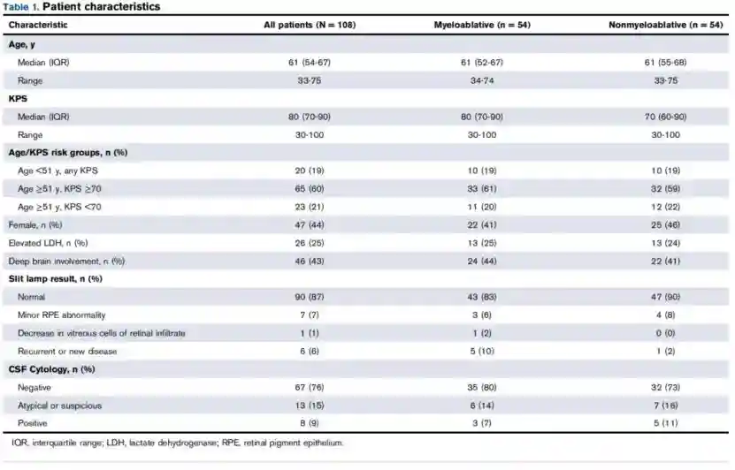 2012年11月17日-2017年5月2日,共纳入113例患者,其中57例患者接受清髓性治疗,56例患者接受非清髓性治疗,5例患者不符合入组条件或未接受治疗。符合条件且接受治疗的患者共108例,并被纳入主要终点分析(图1B)。患者基线特征见表1。