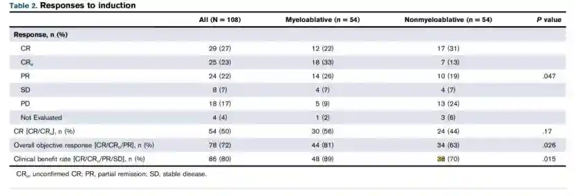 清髓型治疗组和非清髓性治疗组患者均出现了≥3级的血液学AE,并且两组间无显著差异。在接受清髓性治疗的38例患者中,2例(5%)调整了塞替派的剂量,2例(5%)延迟给药,没有漏服药物。2例接受清髓性治疗的患者未完成治疗,1例患者在干细胞动员后拒绝进一步治疗,另外1例患者干细胞采集失败。在接受非清髓性治疗的34例患者中,1例(3%)需要调整阿糖胞苷的剂量,2例(6%)延迟给药,没有漏服药物。在108例接受诱导治疗的患者中,85例(79%)完成了全部5个周期的治疗。诱导治疗结束时,54例患者获得CR(已确认或未确认),24例患者获得部分缓解(PR),总体放射学缓解率为72%。诱导治疗结束时,17例(15.7%)患者疾病进展(PD),清髓性治疗组的患者中有9%的患者发生PD、非清髓性治疗组的患者中有24%的患者发生PD。如表2所示,尽管所有患者均接受相同的诱导方案,但清髓性治疗组缓解的患者多于非清髓性治疗组(81%vs63%)。在接受清髓性治疗的患者中,89%的患者在诱导结束时获得缓解或疾病稳定(SD),而接受非清髓性治疗的患者中这一比例为70%。
