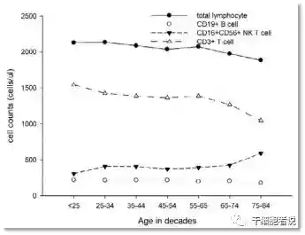 随着年龄的增长,平均淋巴细胞数量逐渐下降。而且,女性淋巴细胞数量比男性的低。这些结果表明,女性比男性更容易感染疾病,并伴随着更快的衰老;