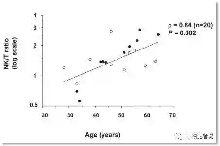 NK细胞与T细胞比值随年龄增长而提高,空心圆代表女性,实心圆代表男性。