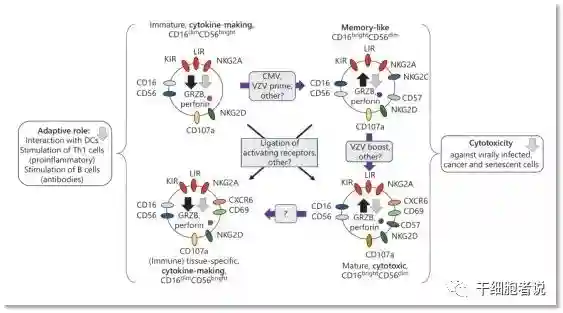 NK细胞的表型和功能变化与其成熟、老化以及暴露于病毒和接种疫苗的影响有关。图中显示了定义NK亚群的主要受体。受体符号的颜色越浓,表明在一些亚群中的表达越高;细胞符号内和描述主要功能的方框中的粗箭头表示,与衰老和/或巨细胞病毒感染相关的特定人群的比例(黑色)和功能(浅灰色)减少或增加。