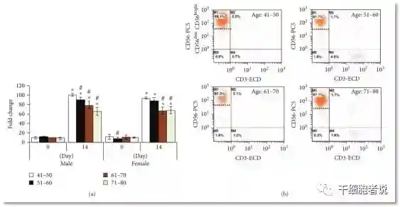 (a)所有年龄组的NK细胞都显著增加,但老年人的NK细胞生长明显低于年轻人;