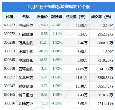 11月30日干细胞板块较上一交易日下跌0.17%,济民医疗领跌。当日上证指数报收于3151.34,上涨0.05%。深证成指报收于11108.5,上涨0.18%。干细胞板块个股涨跌见下表: