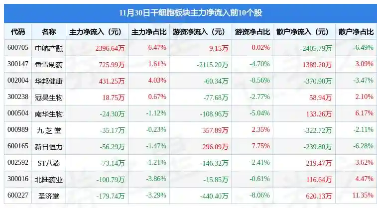 从资金流向上来看,当日干细胞板块主力资金净流出2.18亿元,游资资金净流入1.31亿元,散户资金净流入8642.78万元。干细胞板块个股资金流向见下表: