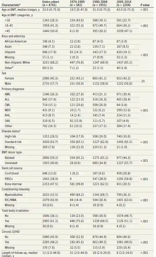 BMTSS是一项队列研究,旨在检查1974年1月1日至2014年12月31日期间,在明尼苏达大学或阿拉巴马大学伯明翰分校进行Allo-HSCT后存活≥2年患者的长期结局。与移植前诊断相匹配的死亡原因被归类为复发相关死亡率(RRM)。所有其他死因均归类为非复发相关死亡率(NRM)。与移植前诊断不同的恶性疾病导致的死亡归类为SMN相关。因心力衰竭、冠状动脉疾病、心律失常、卒中或其他心血管原因导致的死亡归类为CVD相关。因败血症或其他感染原因导致的死亡归类为感染相关。研究者根据移植实践的变化,研究了3个Allo-HSCT时期(1974-1989年;1990-2004年;和2005-2014年)受者的全因死亡率和原因特异性死亡率的趋势。