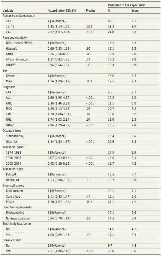 Allo-HSCT后2-35年的死亡率超过了预期的人口死亡率,呈U形曲线,与随访时间最短(移植后2年:39.4例死亡/1000人-年)和随访时间最长(移植后35年:31.0例死亡/1000人-年)的个体的预期死亡率差异更大。Allo-HSCT后患者死亡率随年龄增长而增加,在所有年龄的死亡率均高于普通人群中预期死亡率。在仅限于10年随访的分析中,3个时期的Allo-HSCT受者的减寿年数呈下降趋势(从9.9年至4.2年)(表2)。