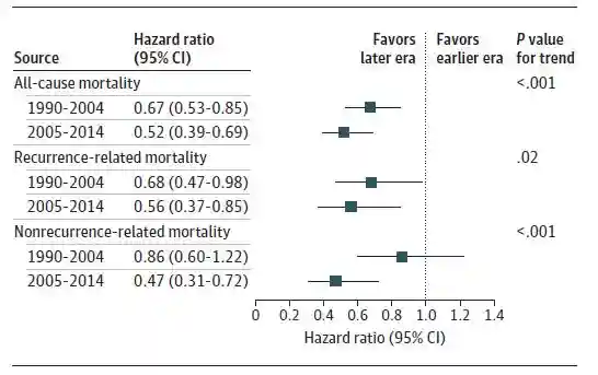 图1:不同移植时代Allo-HSCT受者全因和原因特异性晚期死亡风险的趋势