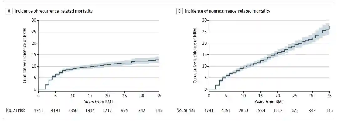 1409例死亡患者中的1175例(83.4%)因死亡而退出,包括RRM(473例[40.3%])、NRM(675例[57.4%])和外部原因(27例[2.3%])。RRM的30年累积发生率为12.2%(95%CI,11.0%-13.4%)(图3A),NRM为22.3%(95%CI,20.4%-24.3%)(图3B)。