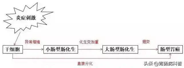 胃粘膜上皮一般每7天更新一次,上皮中存在干细胞,干细胞具有多向分化的潜能,能够分化成熟产生胃粘膜上皮细胞。肠上皮化生常常合并有慢性萎缩性胃炎,在慢性炎症的刺激之下,干细胞分化异常,分化成了肠上皮细胞。