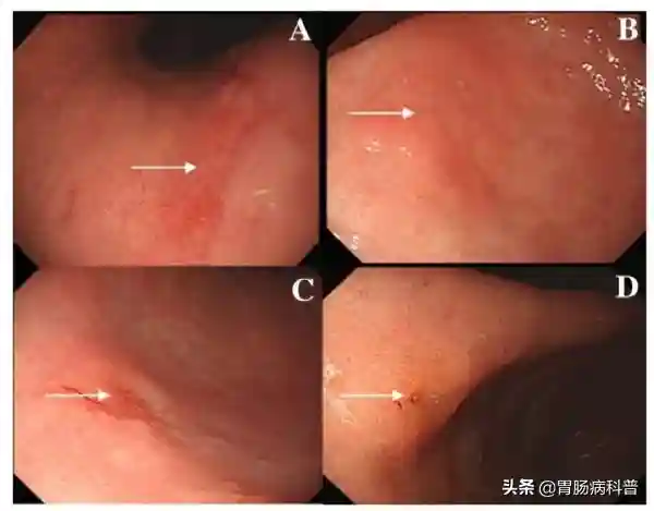 内镜下病变与周围正常胃黏膜无明显区别,组织学表现为异型增生上皮,也应用术语胃上皮异型增生。