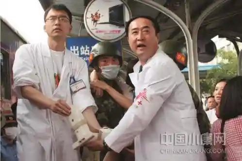 汶川地震发生后,刘中民(右)作为上海第二批医疗队队长,在火车站转运伤员。