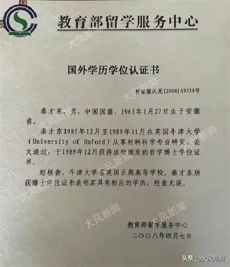 上述公开报道显示,秦才东1980年考入了北京钢铁学院(现北京科技大学)物理化学专业,成为了恢复高考后的第一代大学生,1984年,秦才东留学选拔考试中名列第一,随后经中科院院士、北科大柯俊教授推荐,被国家留基委公派至英国牛津大学攻读材料学方向的博士。之后曾在新加坡和香港的高校任教。