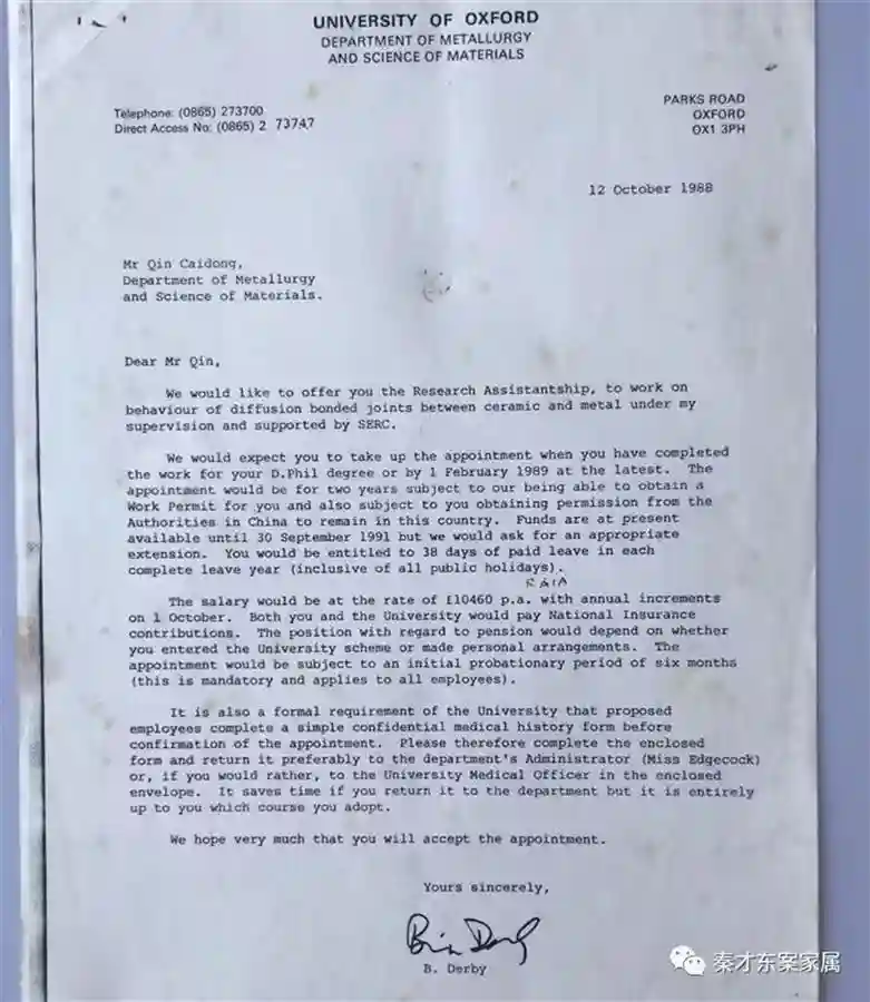 秦才东牛津大学留校聘书