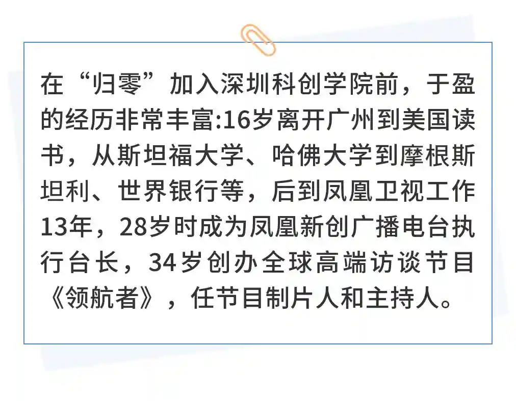 从中国到美国,从斯坦福大学、哈佛大学、美国顶尖投资银行到凤凰卫视,于盈近年在深圳科创学院开启新的征程。