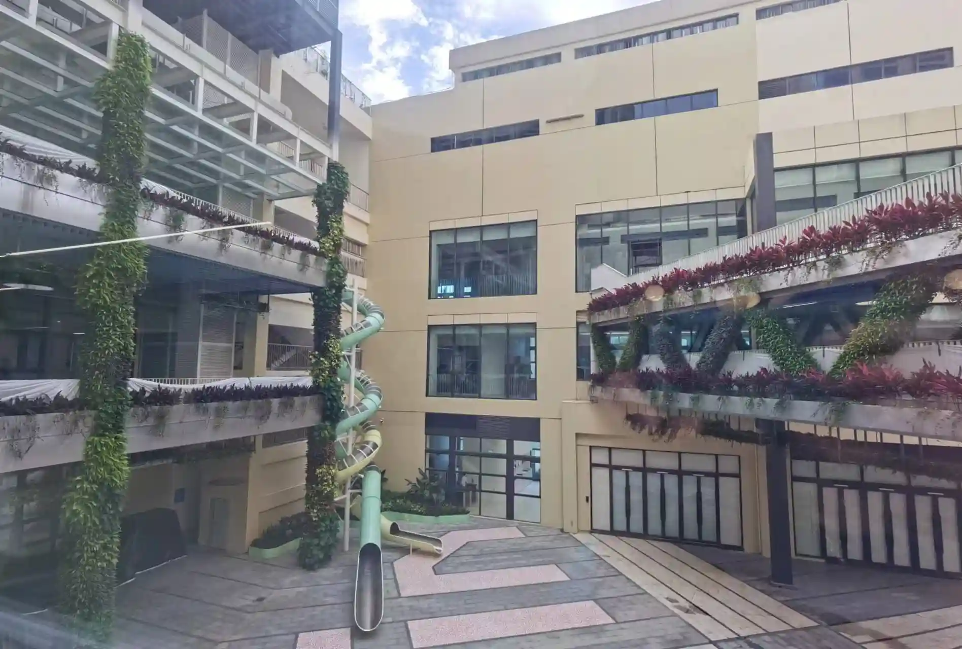 深圳科创学院位于深圳坪山区,有一个两层楼高的滑滑梯。