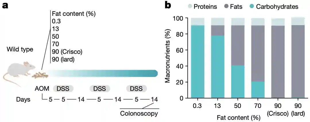 带着这个问题,和MaayanLevy教授团队首先给小鼠准备了6种不同的饮食(蛋白质含量恒定,脂肪/碳水化合物比例不同),其中包括两种生酮饮食,并通过注射偶氮甲烷(AOM)和葡聚糖硫酸钠(DSS)来构建CRC小鼠模型(AOM/DSS诱导CRC小鼠模型)。