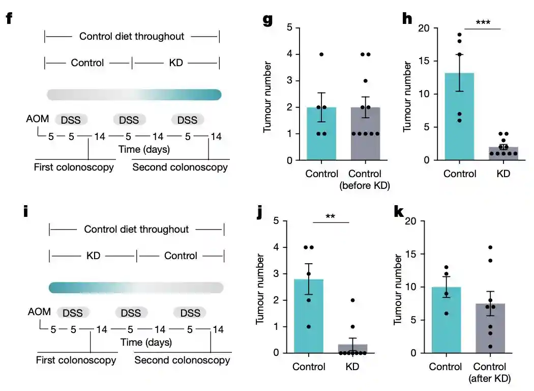 除了抑制肿瘤发生,研究人员发现生酮饮食还可以抑制肿瘤发展。给已形成CRC肿瘤的小鼠喂食生酮饮食后,肿瘤生长明显被抑制,而中断生酮饮食后,肿瘤很快又复发。