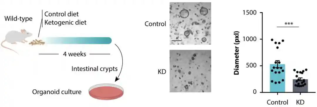 为了验证这一点,研究人员构建了肠道类器官,并发现来自生酮饮食喂养小鼠的肠道干细胞构建的类器官长的明显不如对照组,这一结果佐证了生酮饮食影响了肠道干细胞的功能这一猜想。