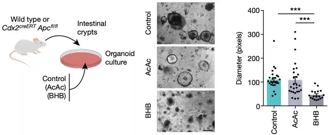 在培养的肠道类器官中分别添加乙酰乙酸和BHB,添加乙酰乙酸的肠道类器官生长未有变化,而添加BHB的肠道类器官生长受到抑制(BHB达到与生酮饮食喂养小鼠肠道内相似的浓度),同时在CRC类器官中也发现了BHB对肿瘤生长的抑制作用,这表明生酮饮食代谢物BHB很可能是抑制肿瘤生长的关键。