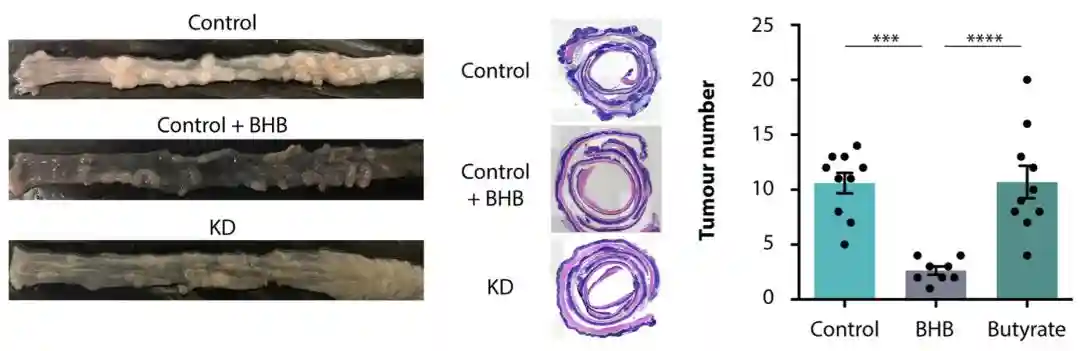 研究人员发现,随着脂肪/碳水化合物比例的增加,小鼠形成的CRC肿瘤数目减少,体积也更小。并在另一CRC小鼠模型(Cdx2creERTApcfl/fl基因编辑自发CRC小鼠模型)中发现了同样的现象。以上研究初步表明,生酮饮食可抑制肿瘤的发生。