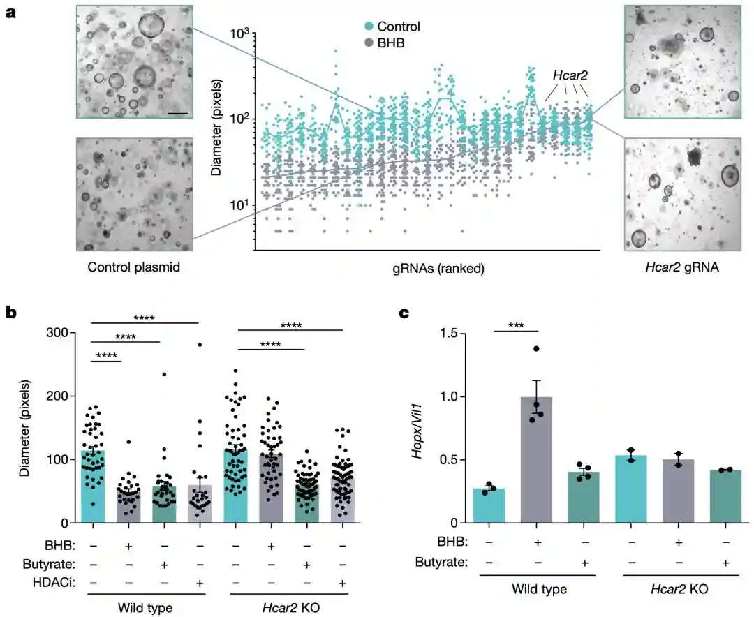 为了寻找BHB与Hopx之间的“桥梁”,研究人员通过CRISPR技术在类器官中筛选BHB的下游基因,包括BHB受体Hcar2和Ffar3,同时还包括受BHB调控的几个基因。