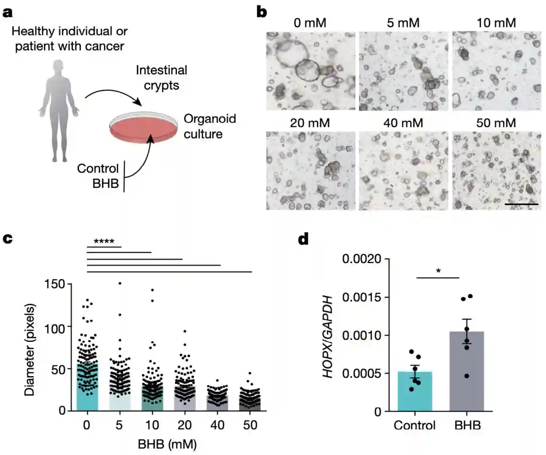 为了寻找下游机制,研究人员对BHB处理后的肠道类器官和对照进行RNA测序,发现BHB处理使得编码抑癌蛋白Hopx的基因表达显著上调。