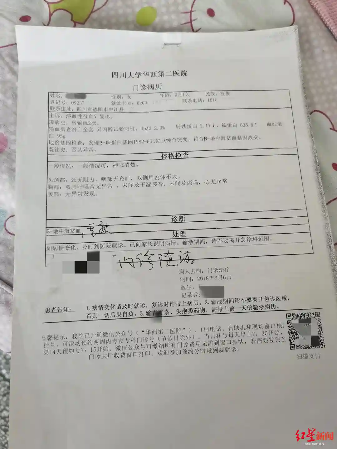 中江当地医院不能做地中海贫血筛查,血样外送,结果出具后,医院建议他们再带孩子去华西第二医院复查。“(医生)说是重度地中海贫血,直接就说必须要骨髓移植,不可能一直靠输血。”陈扬说,医生告诉他们,严重贫血不仅会导致死亡风险,也会影响孩子的生长发育,“孩子长不大。”