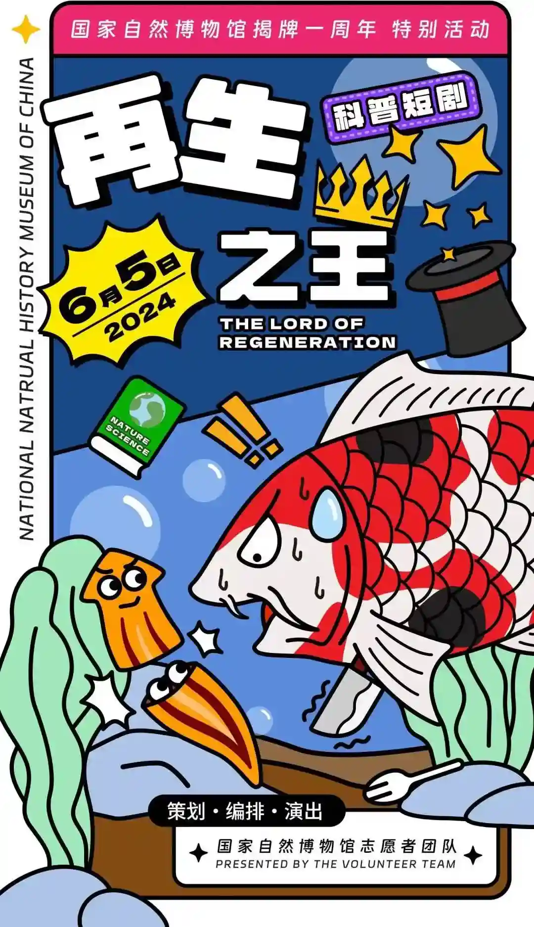 科普剧《再生之王》由国家自然博物馆志愿者团队自编自导自演。神奇的大自然有万千奇妙的生物,它们中有的获得了“永生”的本领,比如:“不死的”涡虫体内有一种特殊的干细胞“万能细胞”。该剧通过魔术与剧情结合,带领公众探索生物“再生”的奥秘,体验独特的科普形式,了解生命繁殖的神奇,揭示生物世界基因的神奇密码。