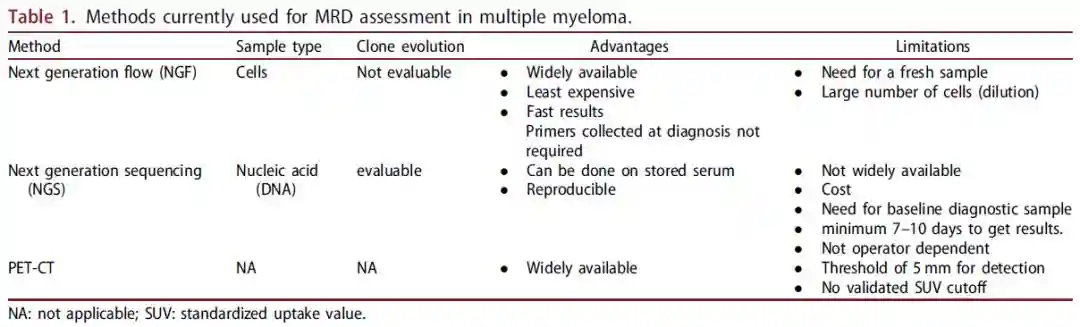 尽管骨髓内MRD阴性,但仍可能存在髓外疾病。用于MRD检测的PET-CT已纳入IMWG指南,并可预测无进展生存期。PET-CT最近已被标准化用于MM和抗浆细胞治疗后,局部病灶以及骨髓FDG摄取量低于肝脏背景值(Deauville量表4)的MRD检测,可预测更长的OS和PFS。磁共振弥散加权成像(DW-MRI)是一种功能性磁共振成像,它根据水分子运动的差异显示组织之间的对比(相对于评估代谢活动的PET-CT)。其主要优点是可以检测到弥漫性骨髓浸润,由于骨髓增生导致的假阳性率相对较低。免疫-PET是一种很有前景的新型MRD成像方法。在10名患者中对其效果进行了评价,结果显示是敏感的,但它在MRD评估中的临床作用仍不清楚。