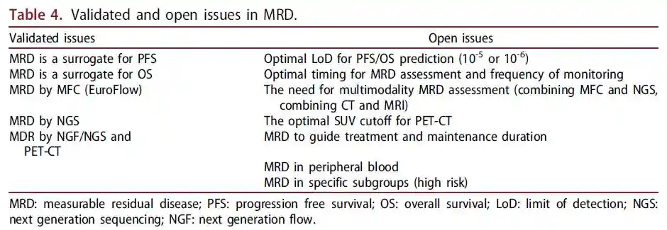 临床实践中使用MRD可预知患者预后。尽管MRD被纳入IMWG反应标准,但没有随机数据支持使用MRD阴性来改变维持治疗的时间、延迟ASCT或根据MRD结果调整治疗。临床试验中要进一步解决的问题是MRD评估时间、获得预测结果的最佳MRD组合,以及MRD是否可以用作监管药物批准的主要研究终点(表4)。