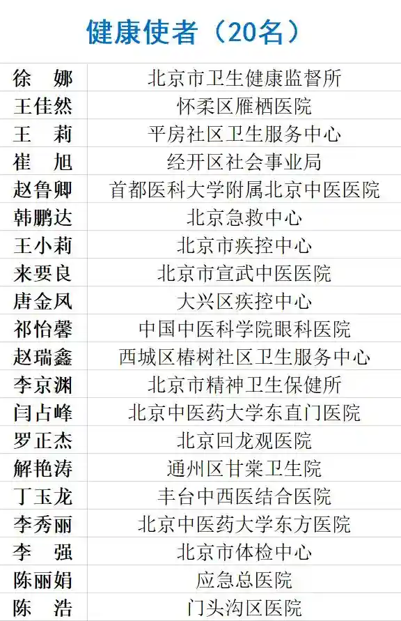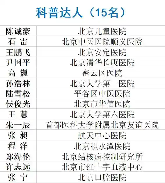 会上评选出2021年首都卫生健康“未来之星”培育计划“科普达人”15名,“专业新星”10名,“仁心医者”10名,“健康使者”20名。(名单附后)