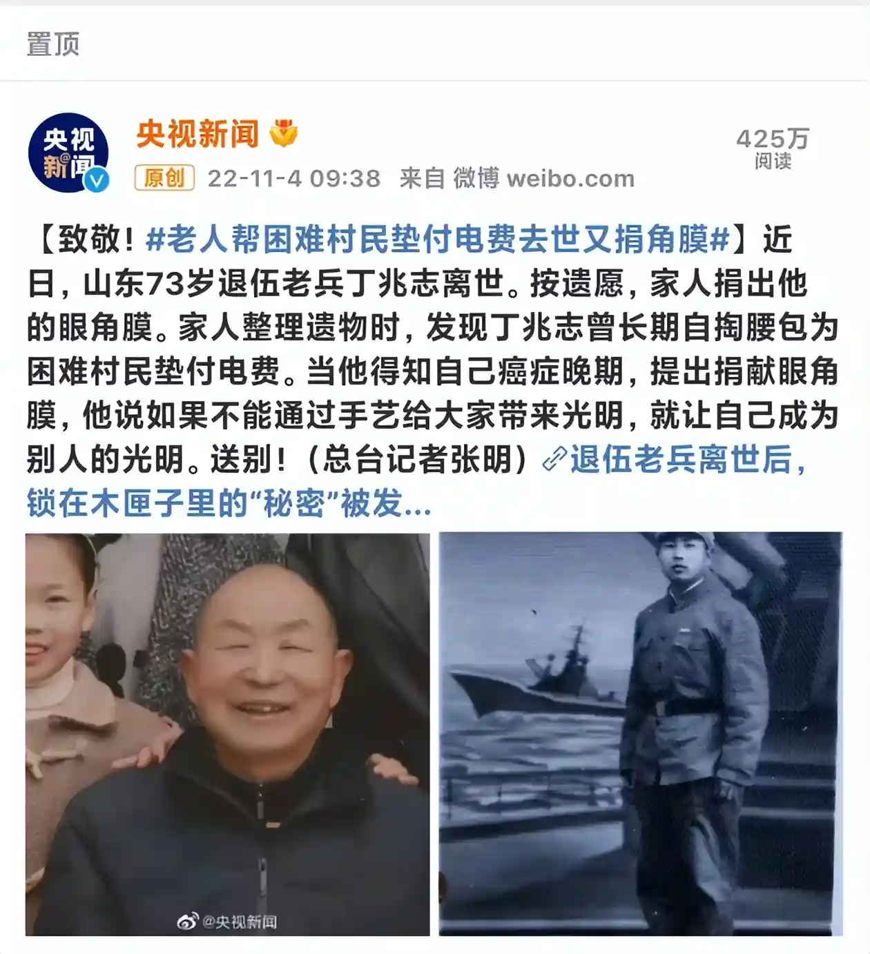 2022年9月29日,日照73岁退伍老兵丁兆志离世。按遗愿,家人捐出他的眼角膜。家人整理遗物时,发现丁兆志曾长期自掏腰包为困难村民垫付电费。当他得知自己癌症晚期,提出捐献眼角膜,他说如果不能通过手艺给大家带来光明,就让自己成为别人的光明。