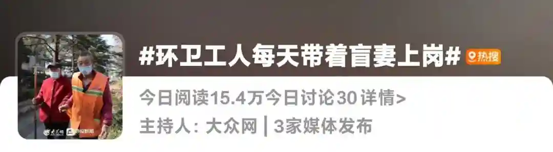 一辆车,一把扫帚,两个人,七年时光。魏乐新妻子双目失明,行动不便,为照顾妻子,大爷在做城市保洁工作时,总是把盲妻带在身边,随时照料,寸步不离…这样的日子,一晃已经有7个年头。