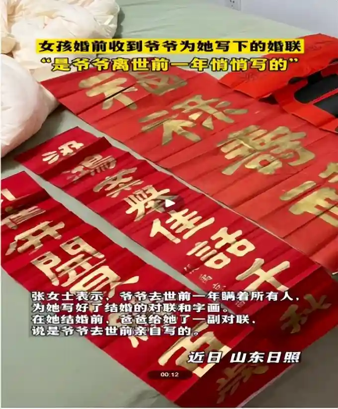 5月2日,日照的张女士结婚前爸爸给了她一个小纸包,里面包着一副婚联,是爷爷去世前亲自写的。大红纸上,金色的字端端正正——“两姓联好琴瑟之乐”“花开并蒂永结同心”,既文雅又喜庆,字里行间满满都是爱意。