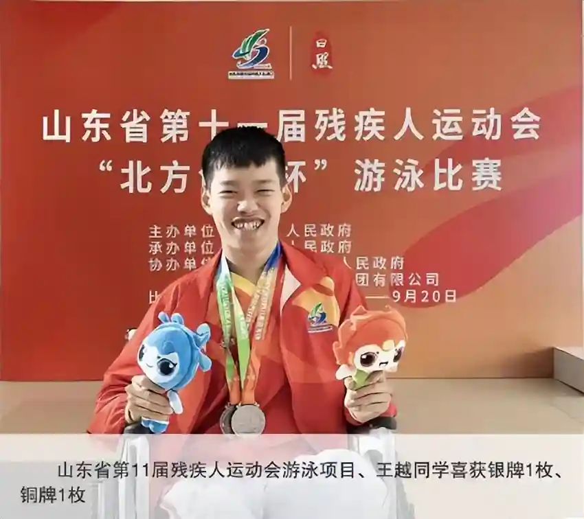 在日照举办的山东省第十一届残疾人运动会开幕式上,一位坐在轮椅上的青涩少男,在其他三位歌手的簇拥下,倾情演唱了会歌《我爱》。2005年,出生11个月的小王越,经诊断因早产缺氧性脑损伤,肢体神经受损。18个月大的时候,父母带他住进了青岛儿童医院,开始了漫长而艰难的康复之路。