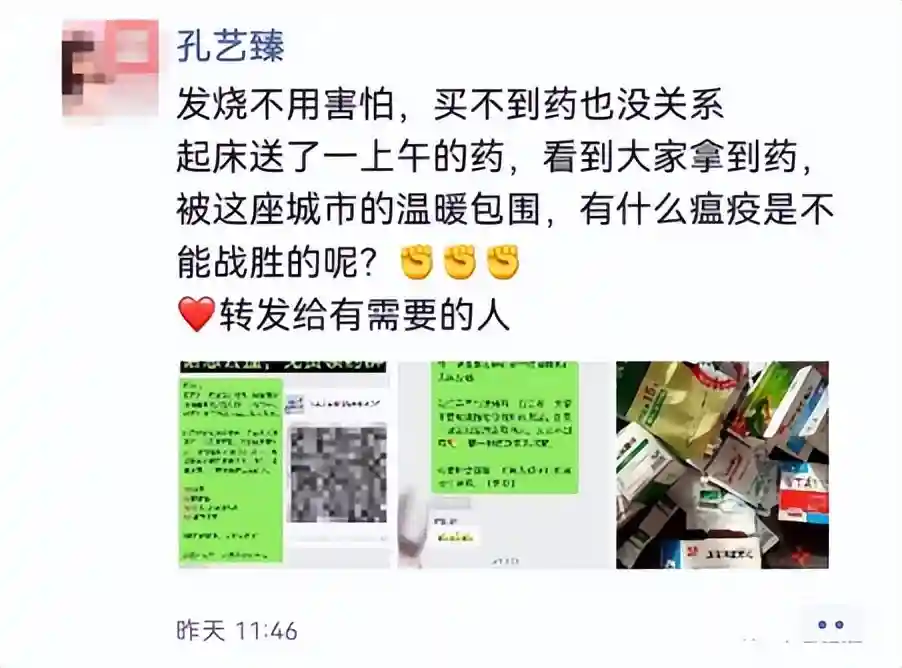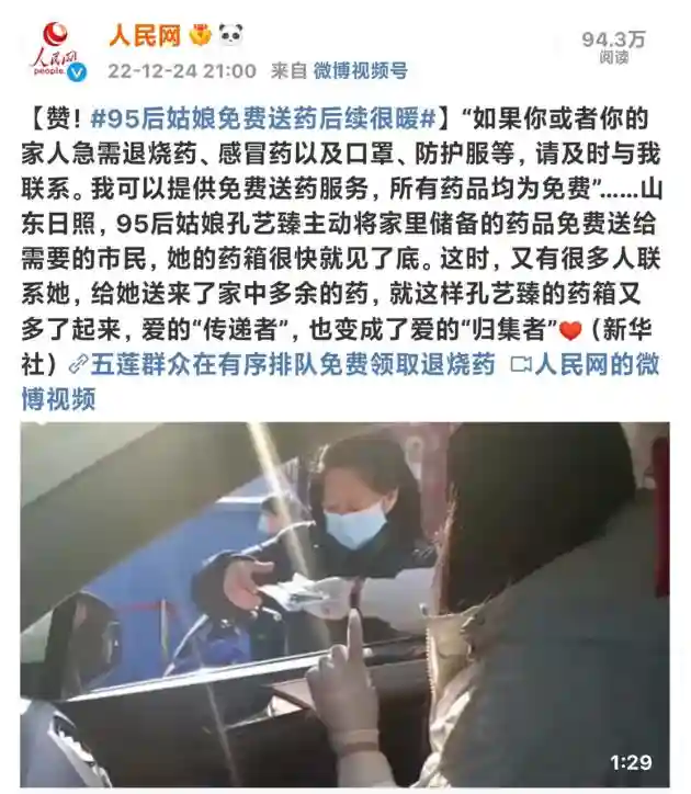 “如果你或者你的家人急需退烧药,感冒药以及口罩、防护服等,请及时与我联系,我可以提供免费送药服务,所有药品均为免费。”发这条朋友圈的是山东省日照市五莲县一位95后的姑娘孔艺臻。得知很多人缺药时,她主动将家里储备的药品免费送给需要的市民。