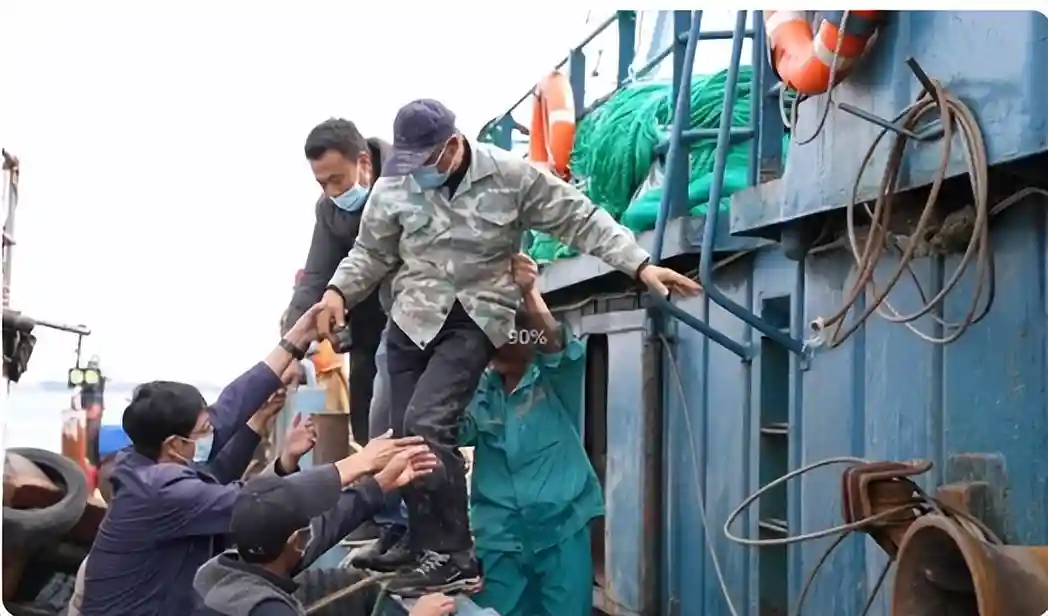 “非常感谢山东渔民在海上救了我们,救了我们三个家庭。”死里逃生,面对救命恩人,三名获救渔民不停地说着感谢。回港后,区渔业协会为其准备的军大衣等衣物,让他们再一次得到“岚山温暖”。