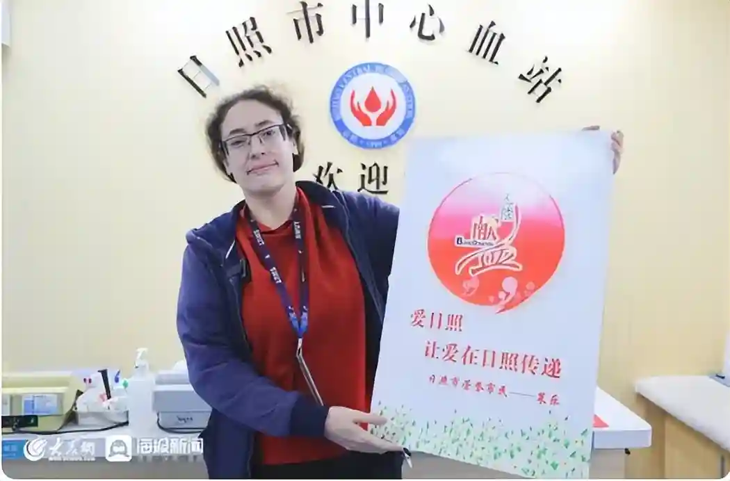 热血传真情,爱心无国界,外国友人,让爱在日照传递。