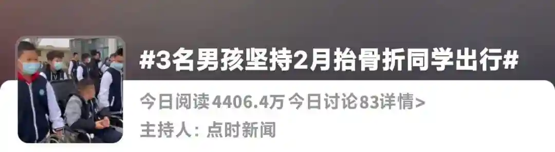 “上课的时候他们会帮我拿书本”“下课的时候他们会帮我打水”“放学的时候他们会帮我推到学校门口”蒋双扬2个月前因不慎摔倒致骨折,无法正常行走,手术后蒋双扬坚持到校上课,同班的秦学桓、王宏源、安久航3人主动提供帮助。