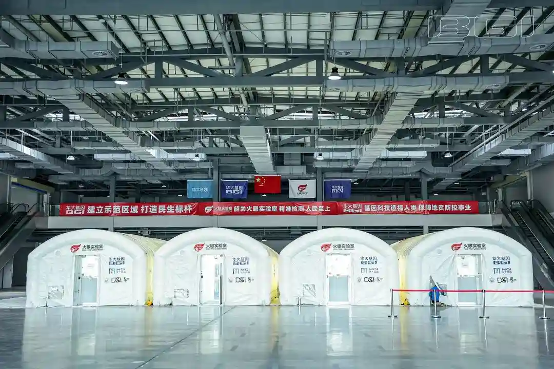 2022年1月5日,在韶关市政府的大力支持下,华大基因联合韶关市妇幼保健院在国际会展中心搭建起6舱气膜“火眼”实验室,该“火眼”实验室严格按照PCR扩增实验室进行设计,承担韶关市免费地中海贫血防控项目的大规模人群基因检测工作。