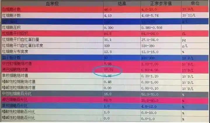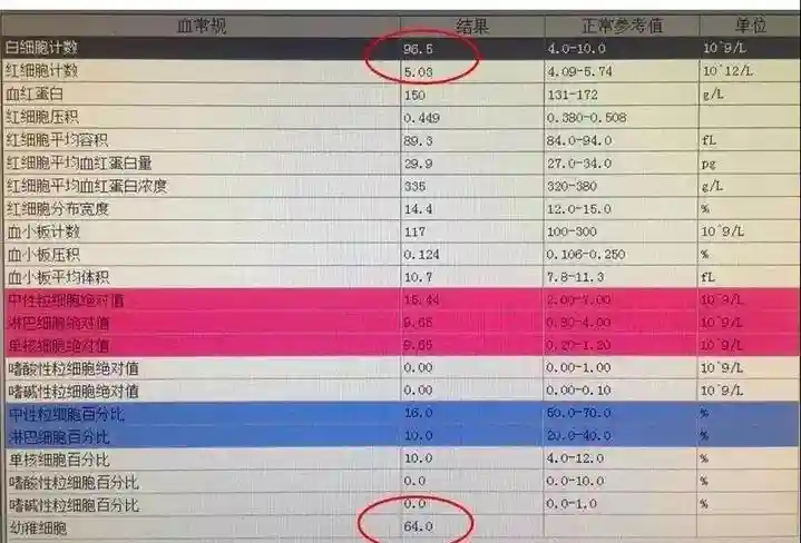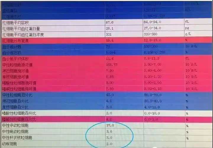 在化验单的末尾,可以看到不应该出现的各个阶段不成熟的粒细胞(中幼粒、晚幼粒、杆状粒),还有少量幼稚细胞。